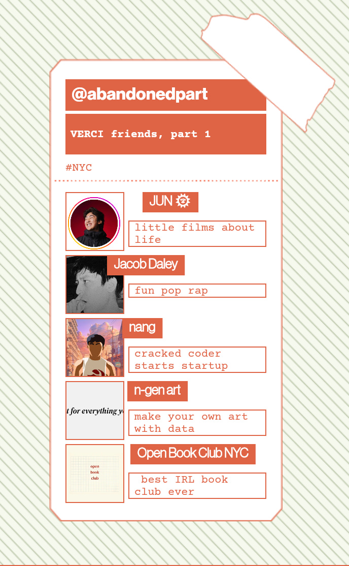 I’m lucky to be part of a community called VERCI based in the fringes of SoHo and these are some of the cool people around me making new things — pop rap, book clubs, art with code. Clicking above now goes straight to my fanzine. Maybe take a look and give one of them a follow on whichever platform they’re on.